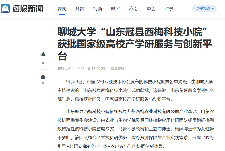 【海报新闻】报道yl7703永利“山东冠县西梅科技小院”获批国家级高校产学研服务与创新平台